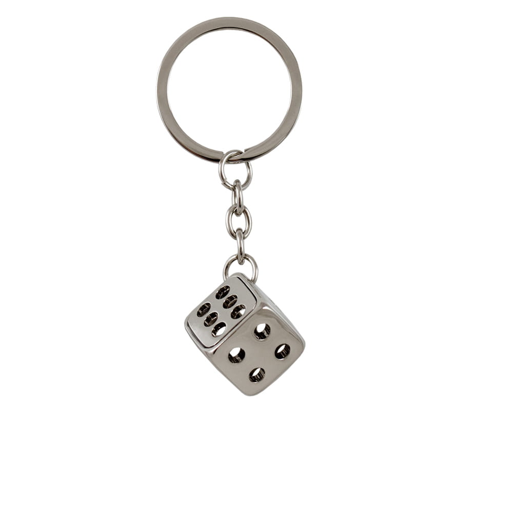 Brelok w kształcie kostki do gry wykonany z metalu. Kostka pusta w środku. Długość breloka 8,5 cm; wymiary kostki: 1,8x1,8 cm. Brelok pakowany w ozdobne, czarne, flokowane wewnątrz pudełeczko.
