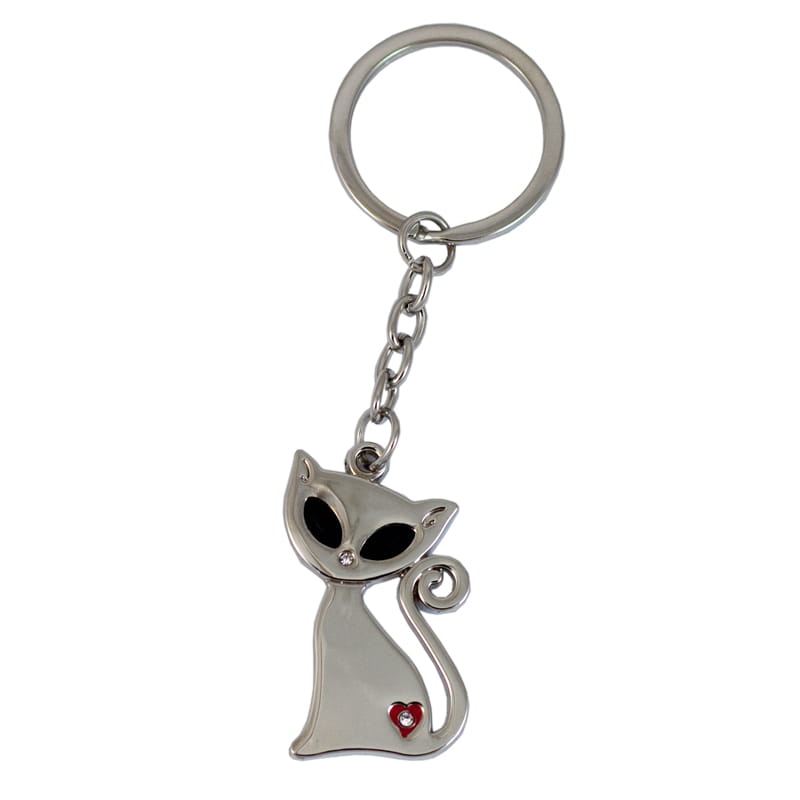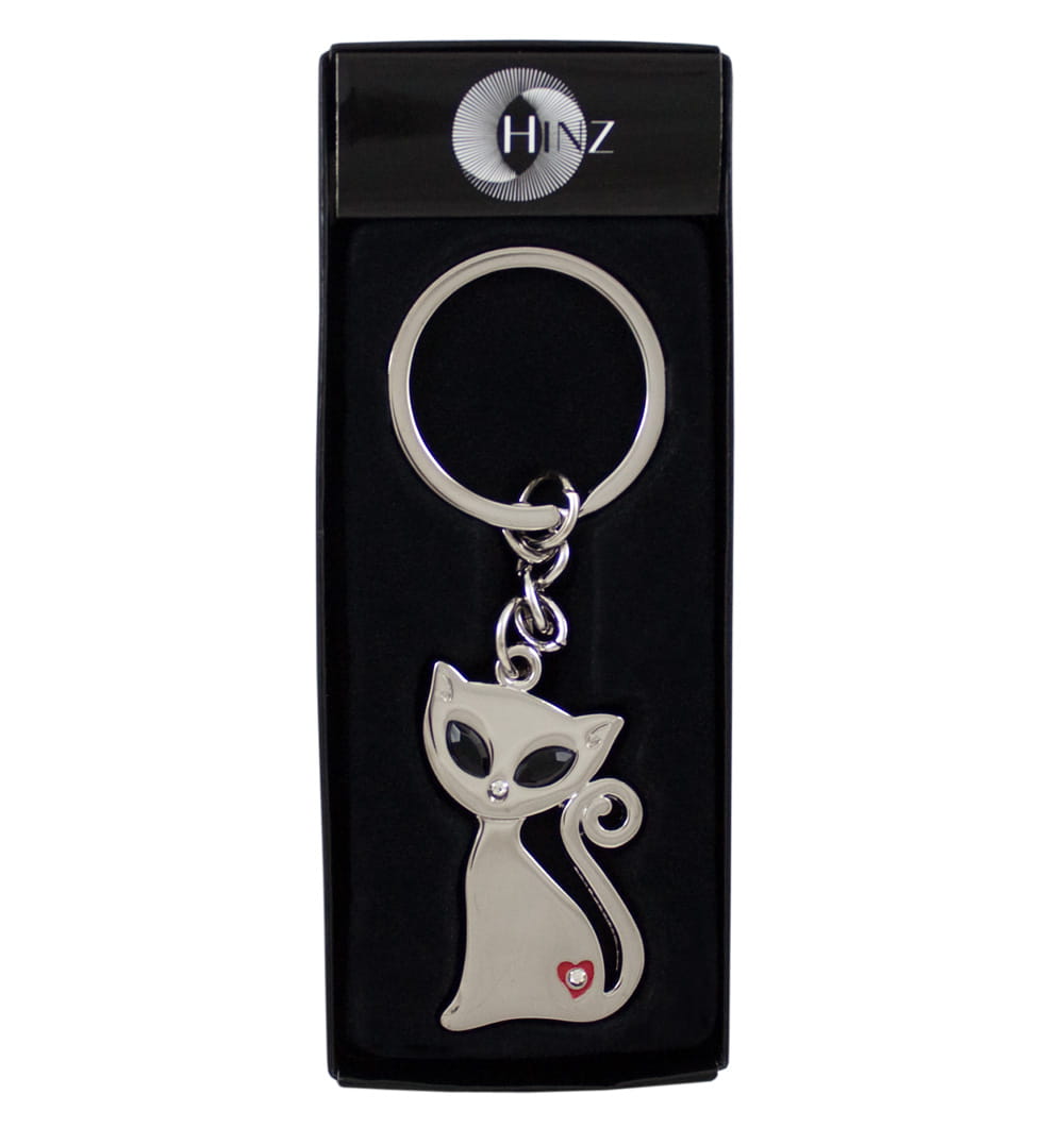 Brelok w kształcie kota, wykonany z metalu w wykończeniu błyszczącym. Kotek ozdobiony cyrkoniami i błyszczącymi koralikami. Długość breloka 11,3 cm; wymiary kotka: 4,5 x 2,9 cm. Brelok zapakowany w ozdobne, czarne, flokowane wewnątrz pudełeczko.