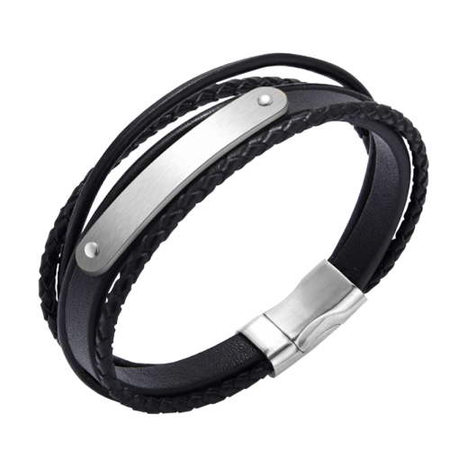 Bransoletka wykonana z czarnej skóry, posiada zapięcie w kolorze srebrnymi i ozdobny element do graweru ze stali nierdzewnej. Rozmiar 23 cm, można też zmniejszyć do koniecznej długości przy zapięciu. Zapakowana w czarne etui z logo Enzo Mancini.