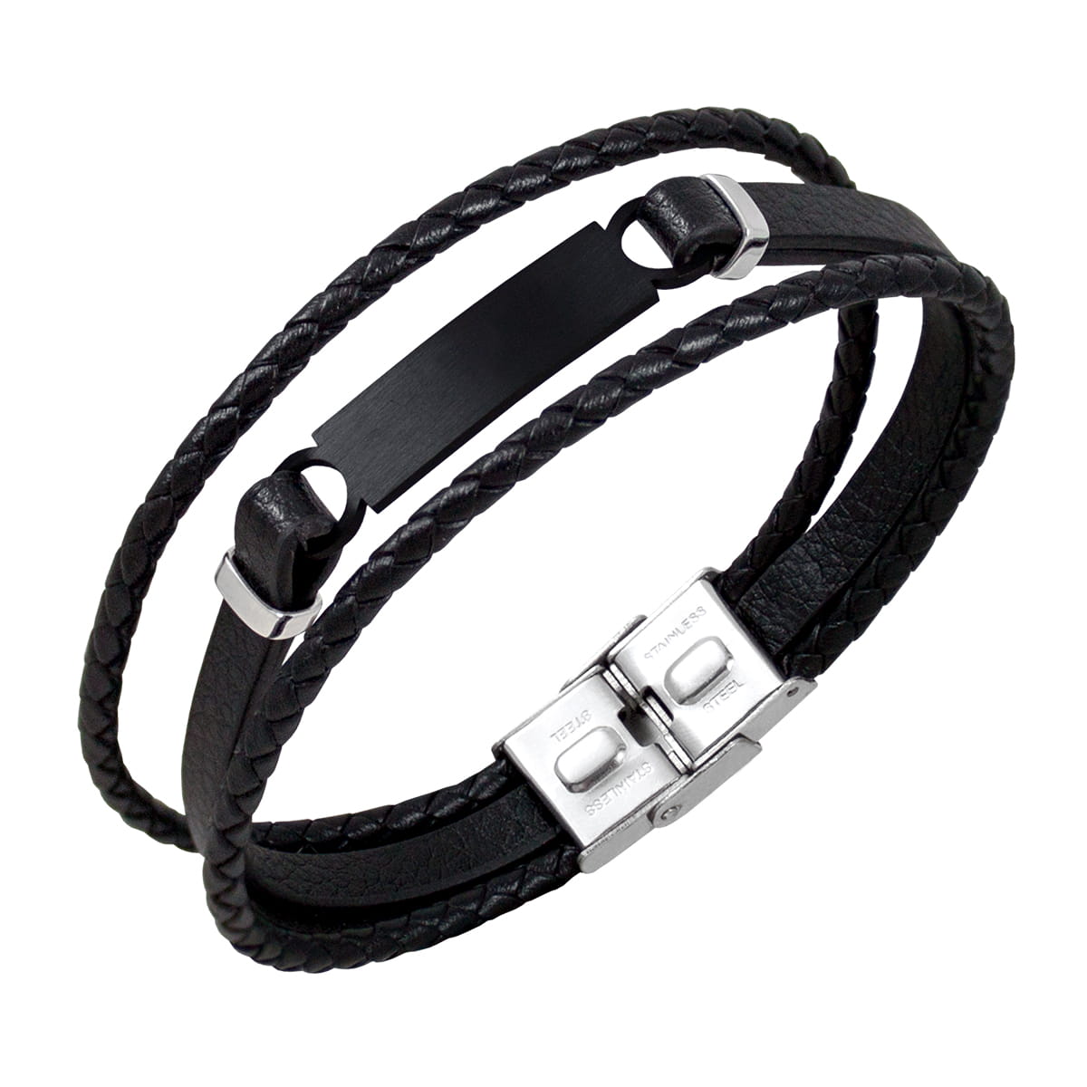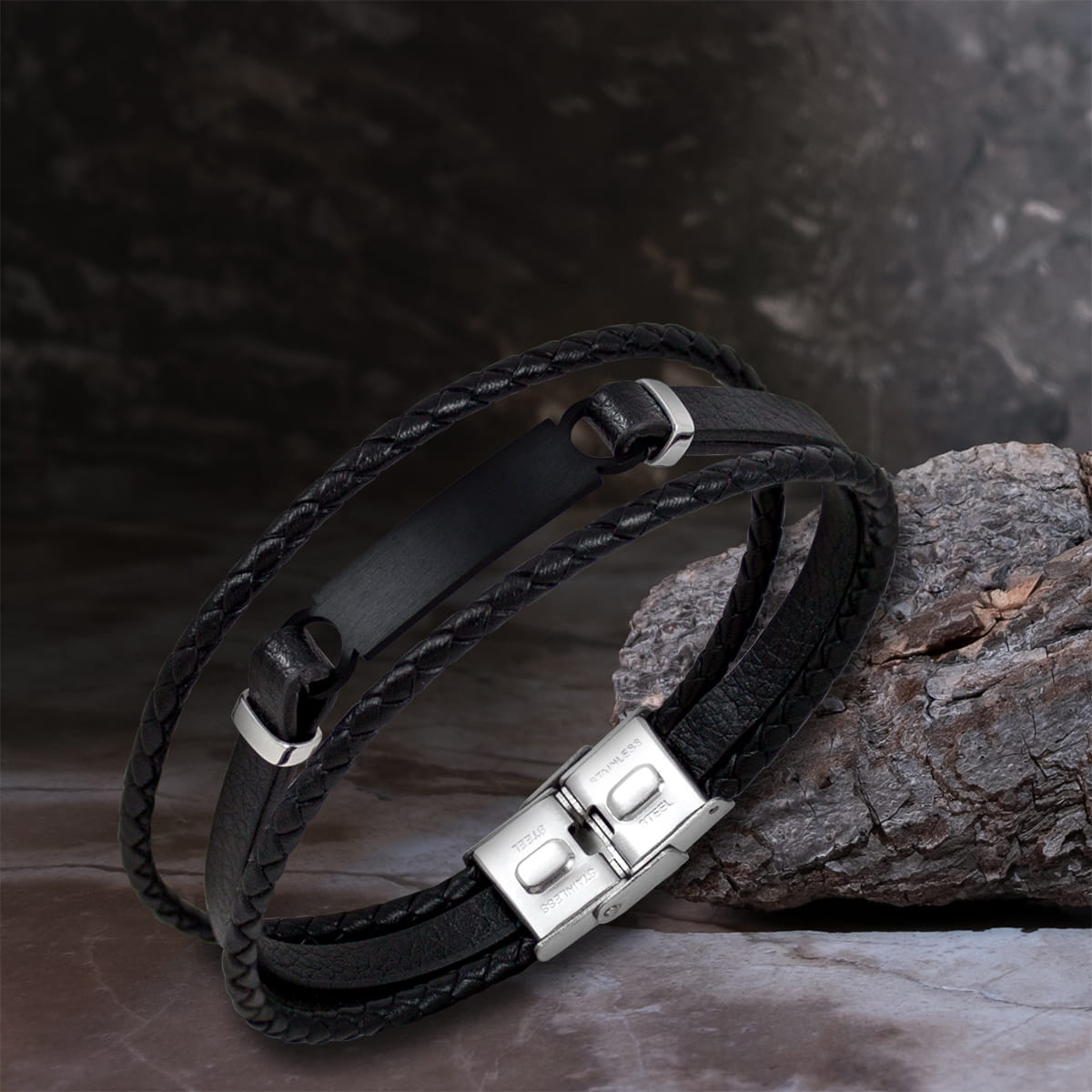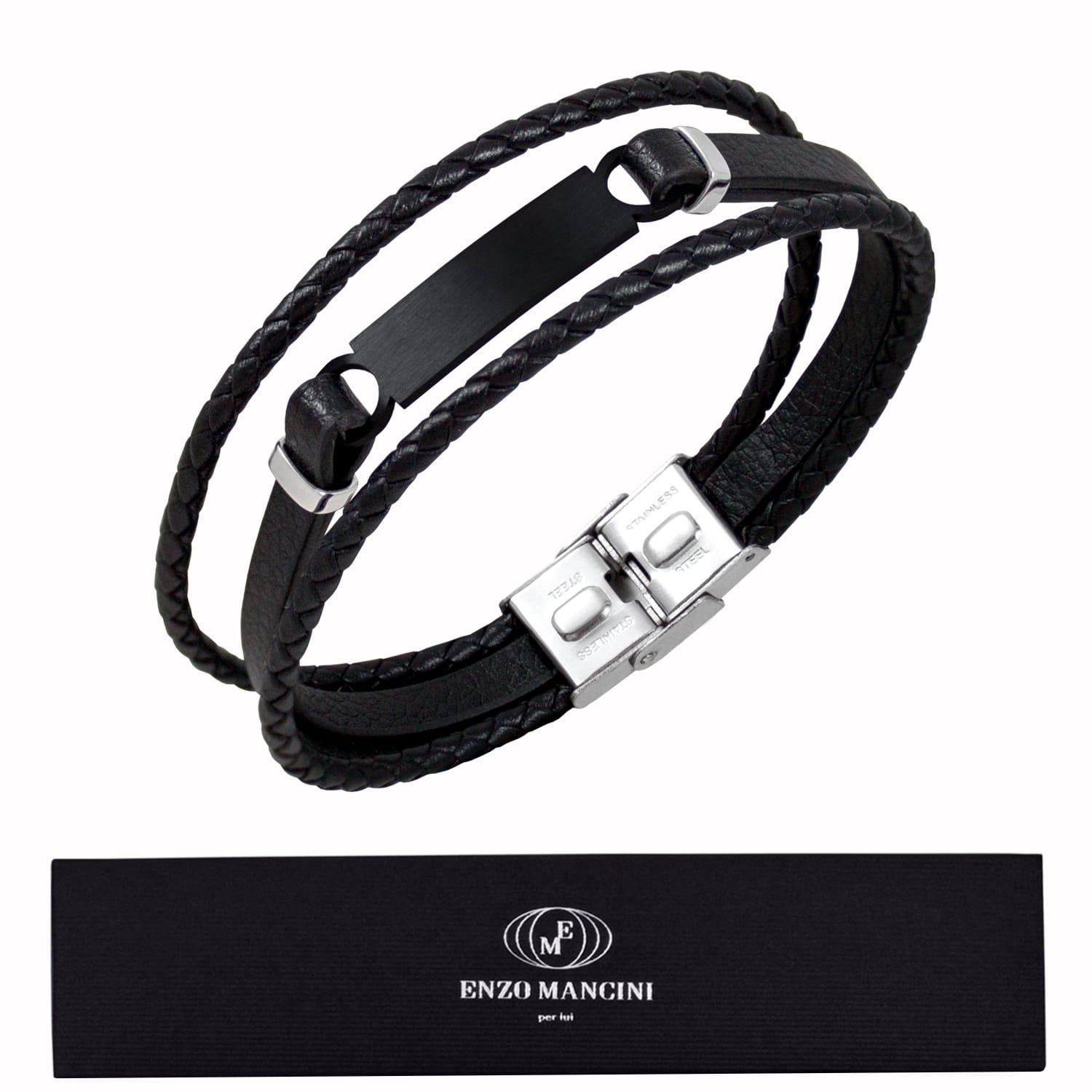Bransoletka wykonana z czarnej skóry, posiada zapięcie w kolorze srebrnymi i ozdobny element do graweru ze stali nierdzewnej. Rozmiar 23 cm, można też zmniejszyć do koniecznej długości przy zapięciu. Zapakowana w czarne etui z logo Enzo Mancini.