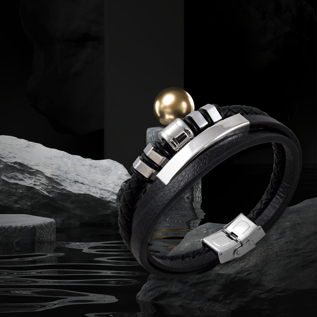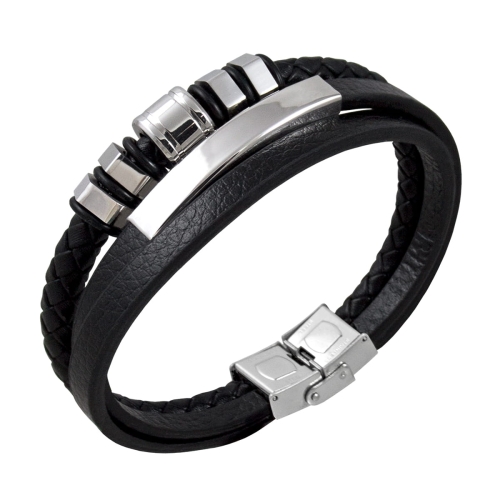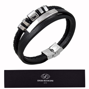 Bransoletka wykonana z czarnej skóry, posiada zapięcie w kolorze srebrnymi i ozdobny element do graweru ze stali nierdzewnej. Rozmiar 23 cm, można też zmniejszyć do koniecznej długości przy zapięciu. Zapakowana w czarne etui z logo Enzo Mancini.