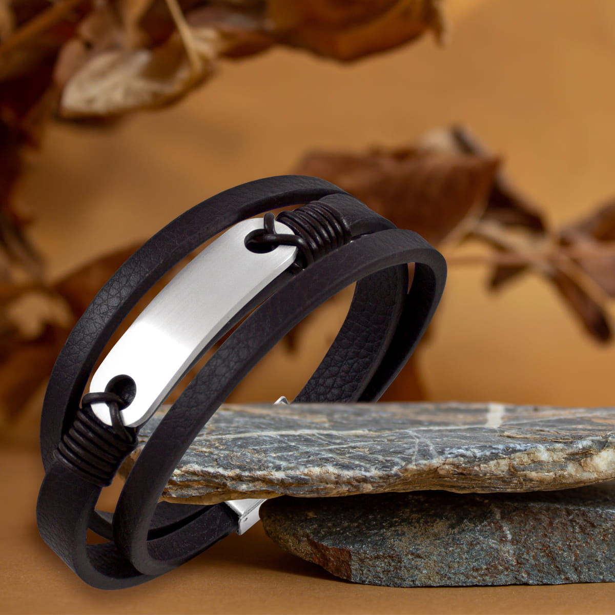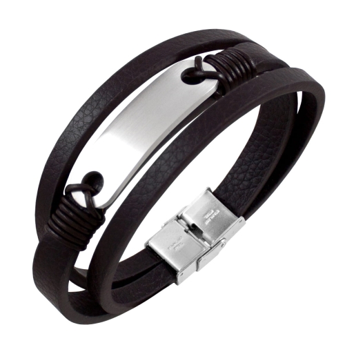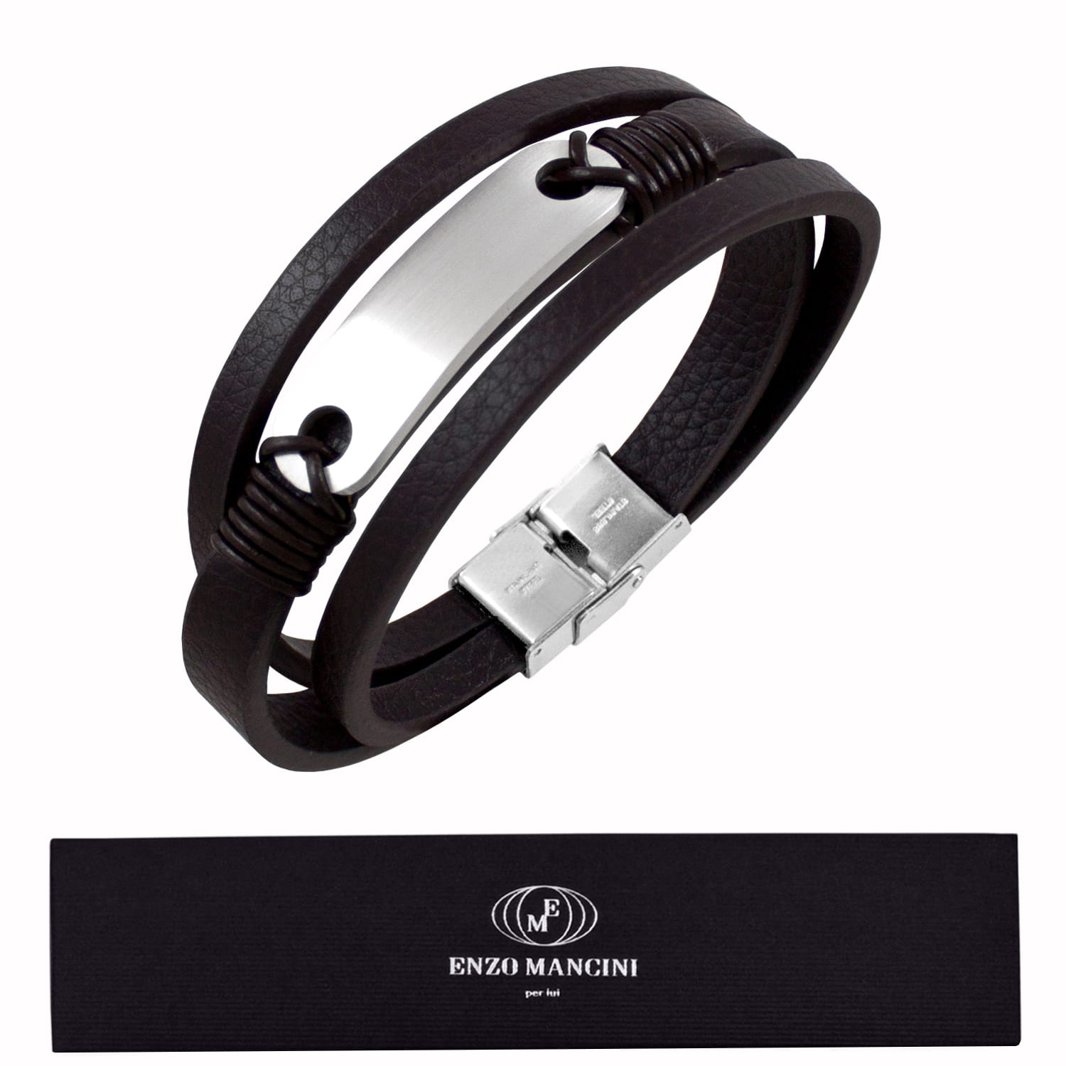 Bransoletka wykonana z brązowej skóry, posiada zapięcie w kolorze srebrnymi i ozdobny element do graweru ze stali nierdzewnej. Rozmiar 23 cm, można też zmniejszyć do koniecznej długości przy zapięciu. Zapakowana w czarne etui z logo Enzo Mancini.