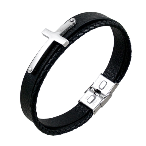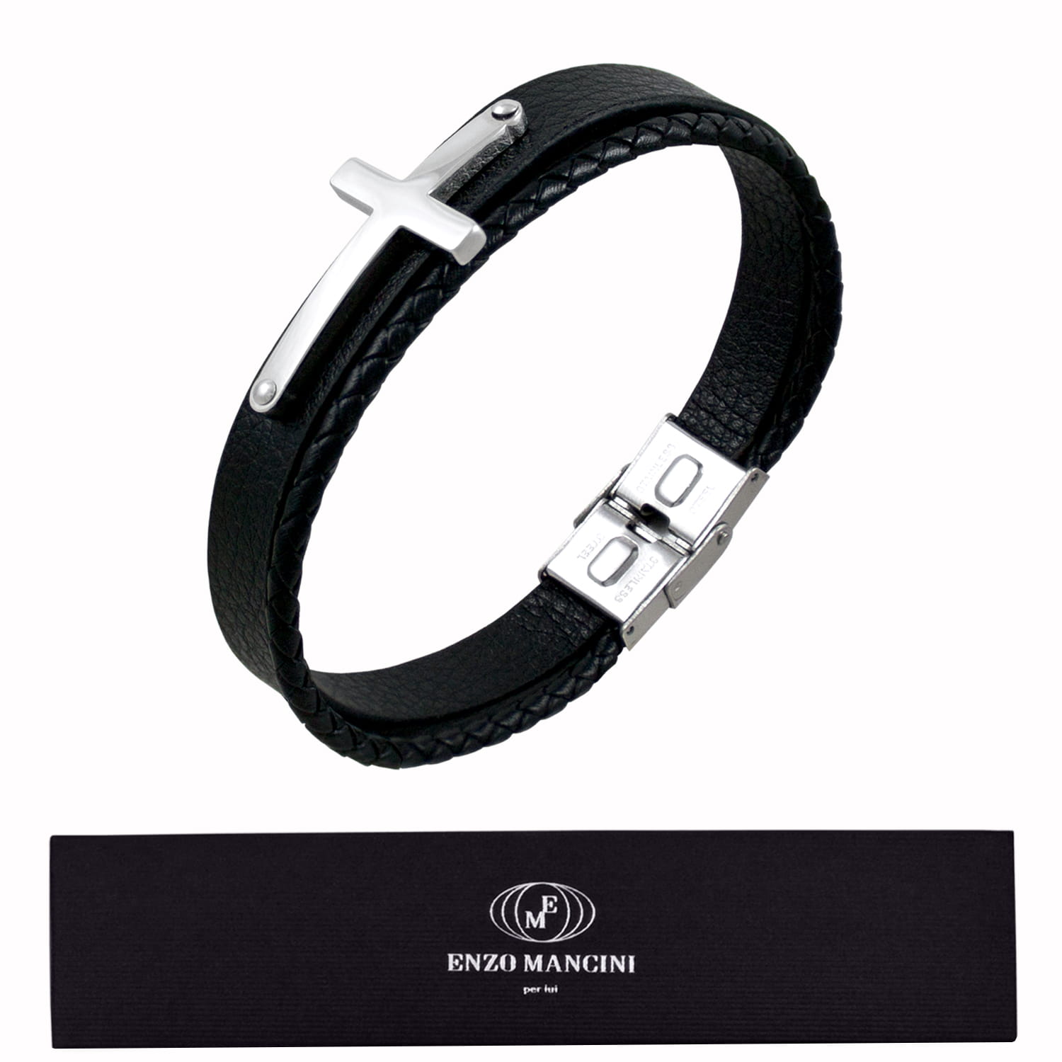 Bransoletka wykonana z czarnej skóry, posiada zapięcie w kolorze srebrnymi i krzyżyk ze stali nierdzewnej. Rozmiar 23 cm, można też zmniejszyć do koniecznej długości przy zapięciu. Zapakowana w czarne etui z logo Enzo Mancini.