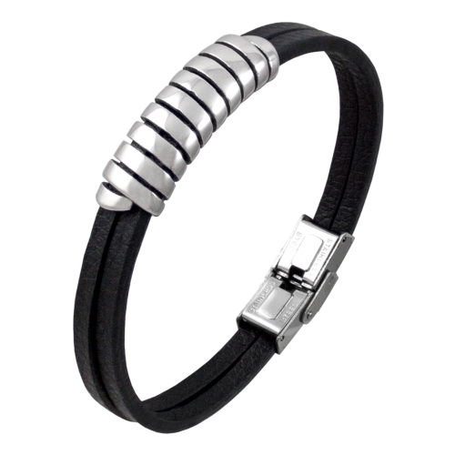 Bransoletka wykonana z czarnej skóry, posiada zapięcie w kolorze srebrnymi i ozdobny element ze stali nierdzewnej. Rozmiar 22 cm, można też zmniejszyć do koniecznej długości przy zapięciu. Zapakowana w czarne etui z logo Enzo Mancini.