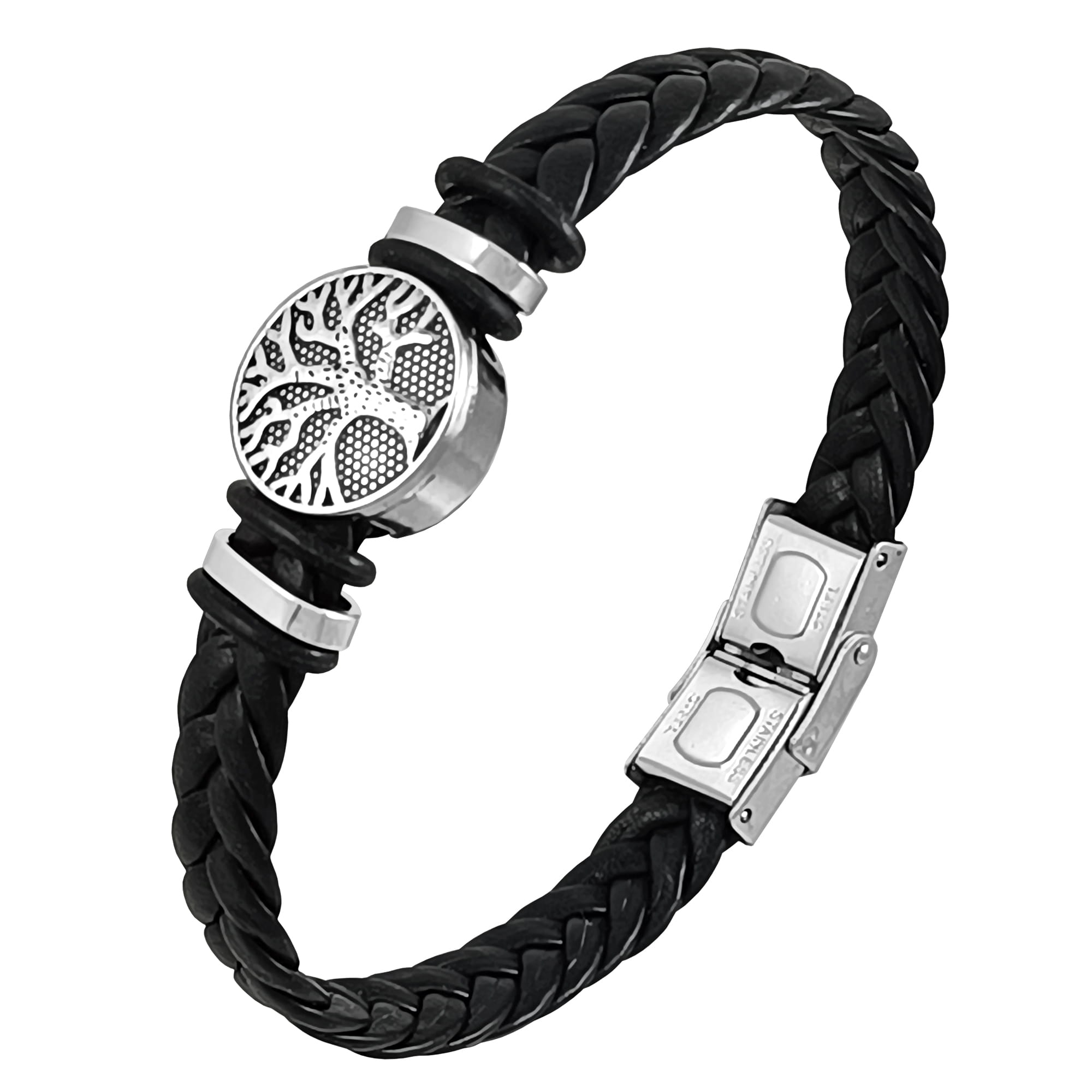 Bransoletka wykonana z czarnej pleci0nej skóry, posiada zapięcie w kolorze srebrnymi i ozdobny element ze stali nierdzewnej. Rozmiar 21,5 cm, można też zmniejszyć do koniecznej długości przy zapięciu. Zapakowana w czarne etui z logo Enzo Mancini.