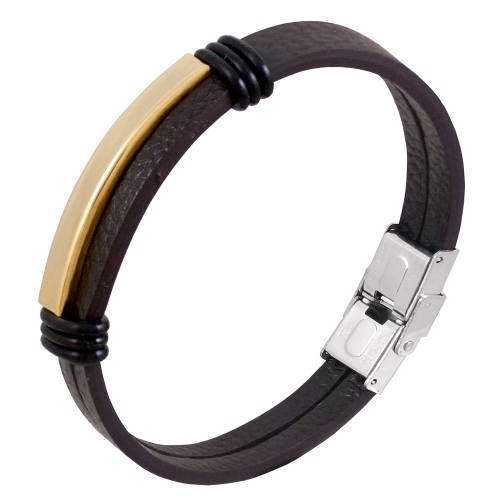 Bransoletka wykonana z brązowej skóry, posiada zapięcie w kolorze srebrnymi i ozdobny element do graweru ze stali w kolorze złotym. Rozmiar 21,5 cm, można też zmniejszyć do koniecznej długości przy zapięciu.