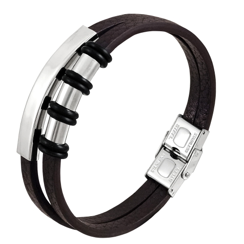 Bransoletka wykonana z brązowej skóry, posiada zapięcie w kolorze srebrnymi i ozdobne element do graweru ze stali nierdzewnej. Rozmiar 21,5 cm, można też zmniejszyć do koniecznej długości przy zapięciu. Zapakowana w czarne etui z logo Enzo Mancini.