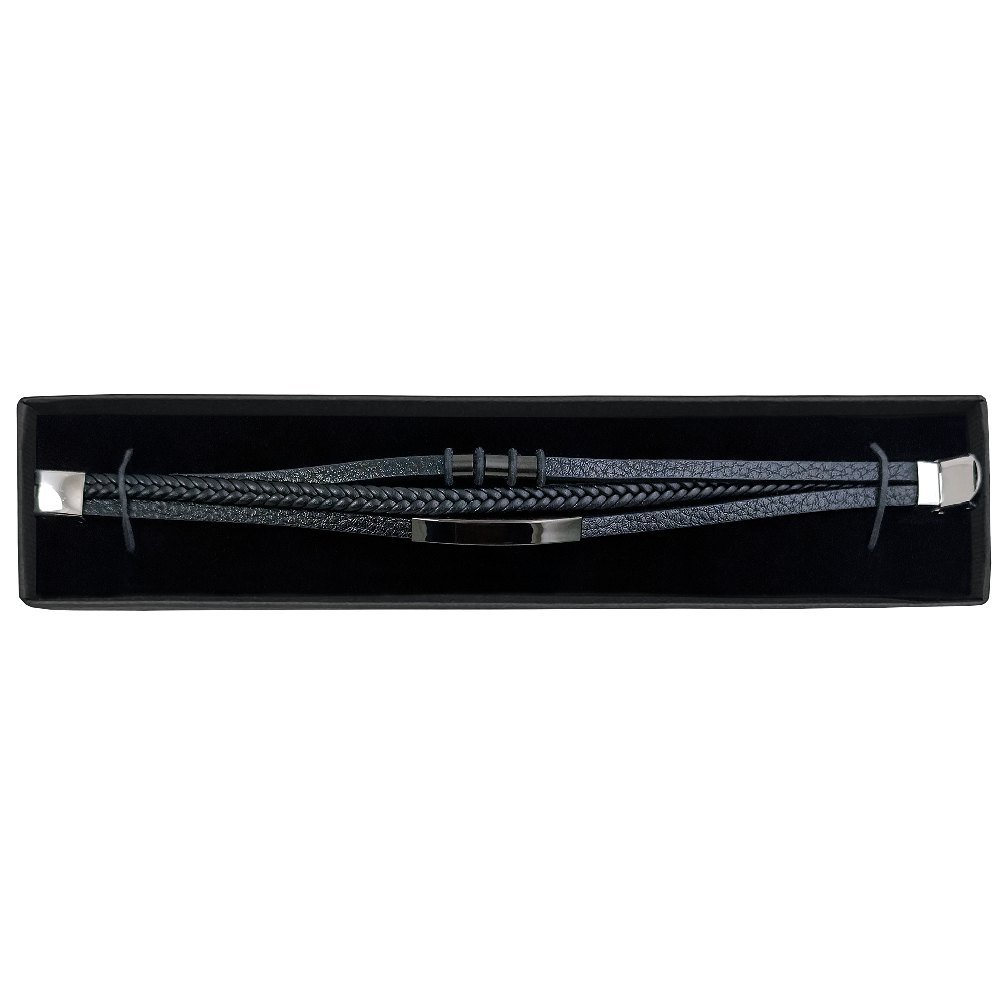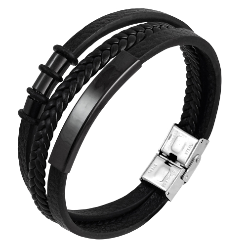 Bransoletka wykonana z czarnej skóry eko, posiadająca regulację do koniecznej długości w zapięciu o kolorze srebrnymi i ozdobne czarne elementy do graweru. Rozmiar bransoletki 23 cm. Zapakowana w eleganckie grafitowe etui z logo Enzo Mancini.