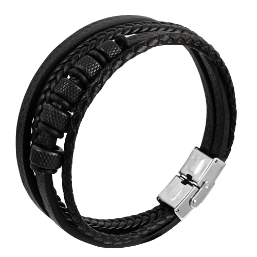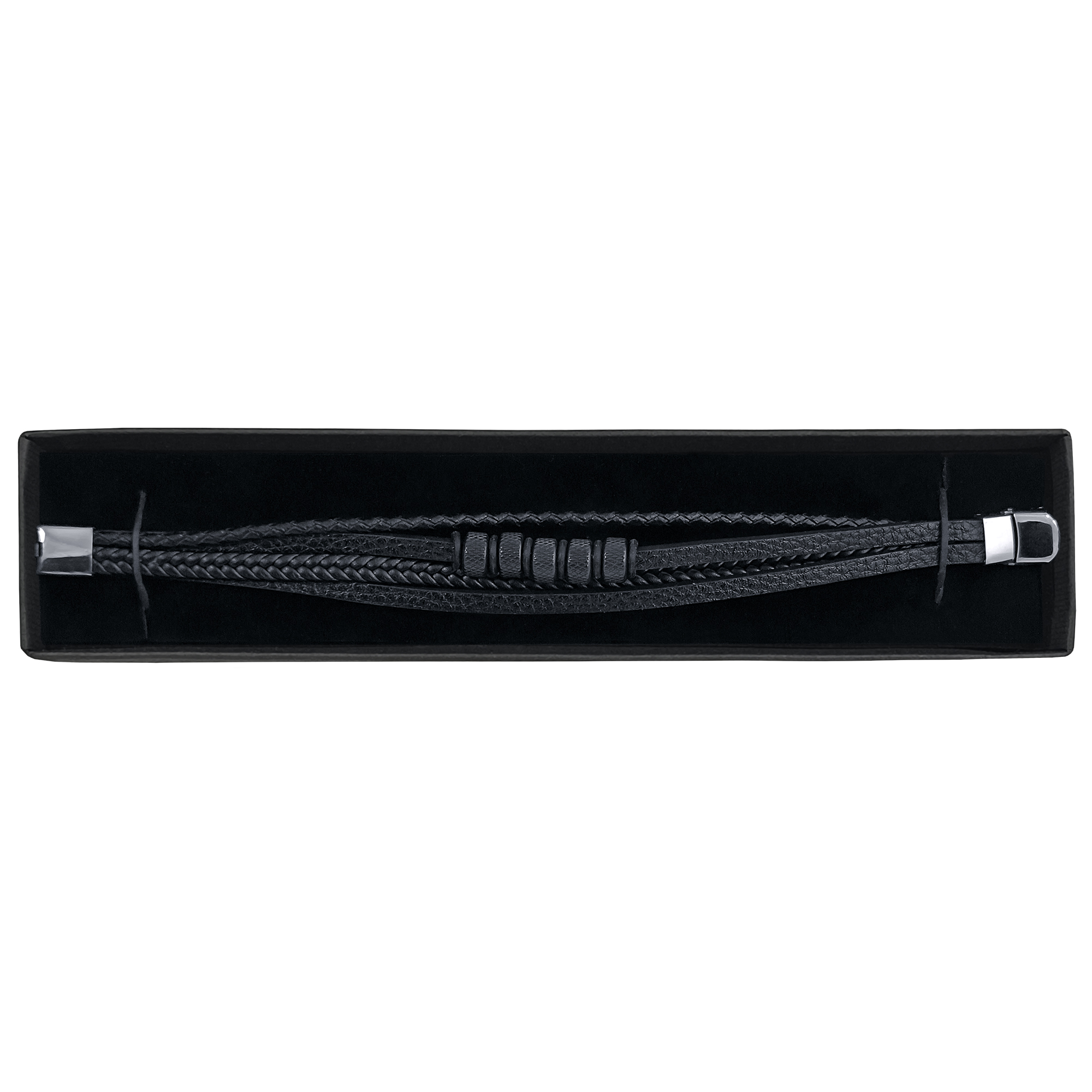 Bransoletka wykonana z czarnej skóry, posiada zapięcie w kolorze srebrnymi i ozdobne elementy w czarnym kolorze. Rozmiar 23 cm, który można zmniejszyć skracając długość przy zapięciu. Zapakowana w czarne etui z logo Enzo Mancini.