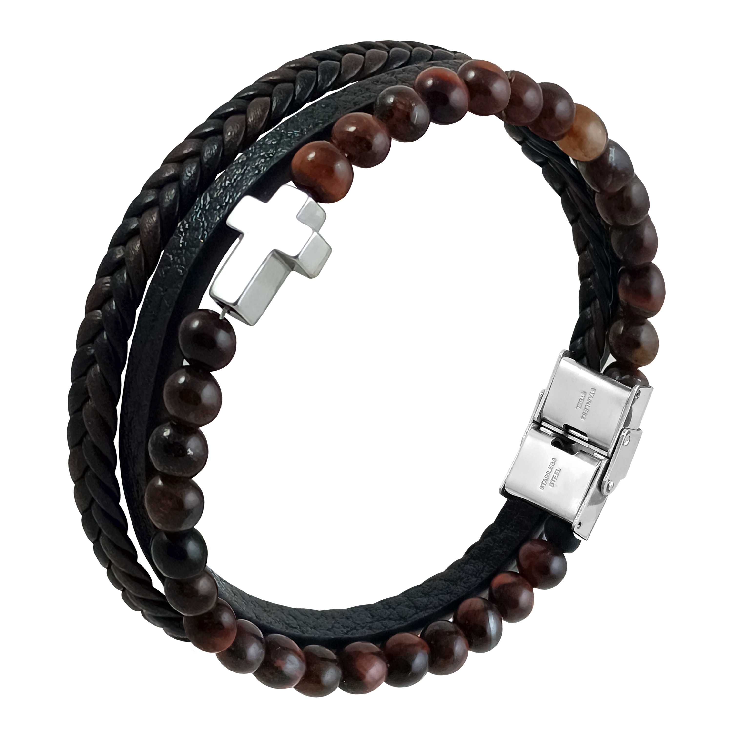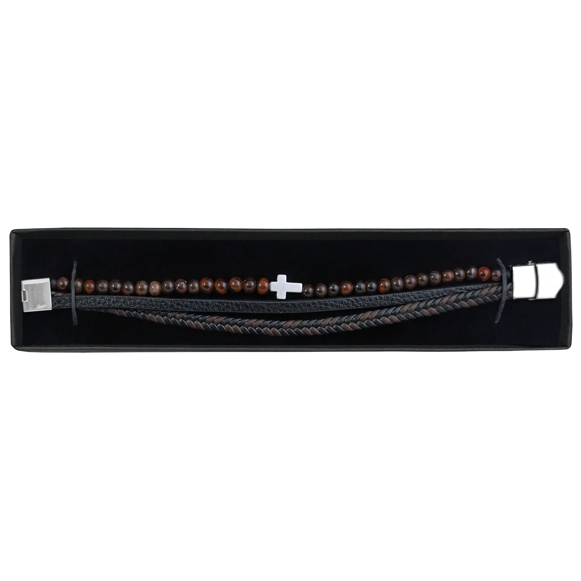 Bransoletka wykonana z czarnej skóry i brązowych koralików. Posiada zapięcie i krzyżyk w kolorze srebrnymi do graweru. Rozmiar 23 cm, który można zmniejszyć skracając długość przy zapięciu. Zapakowana w czarne etui z logo Enzo Mancini.