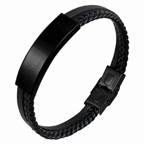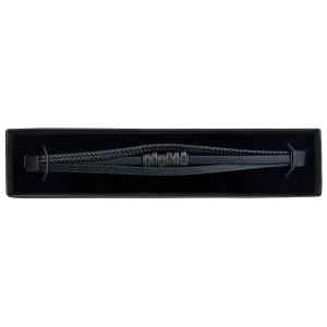 Bransoletka wykonana z czarnej plecionej skóry, posiada zapięcie w kolorze grafitowym orazi ozdobny element do graweru w czarnym kolorze. Rozmiar 21 cm, który można zmniejszyć skracając długość przy zapięciu. Zapakowana w czarne etui z logo Enzo Mancini.