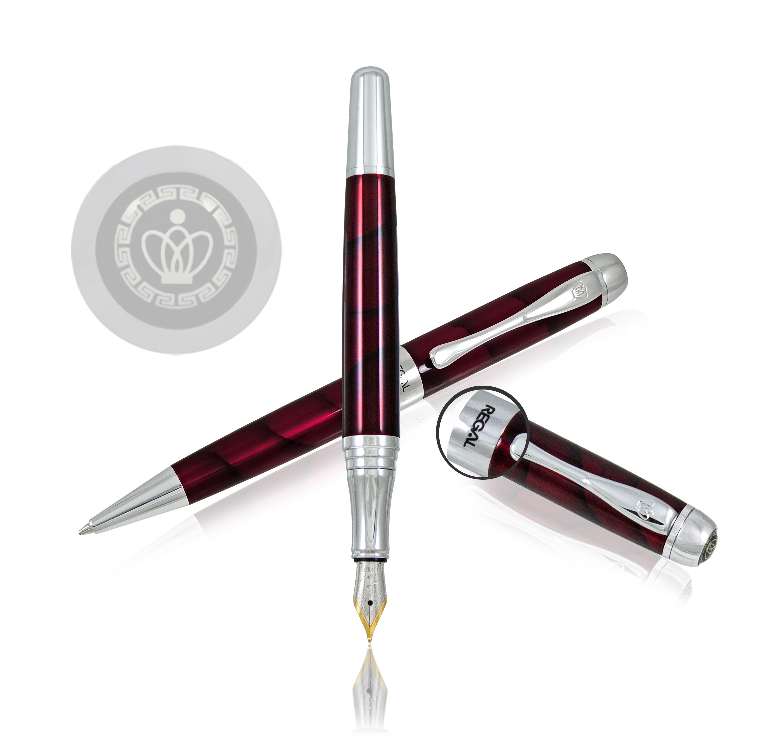 Elegancki komplet REGAL "Andrew" w kolorze transparentnym i srebrnymi okuciami zawierający pióro ze srebrno - złotą stalówką (1,8 x 0,8 cm), ozdobioną grawerem z emblematem marki Regal. Długopis z wykręcanym wkładem. Zestaw zapakowany w ozdobne pudełko.