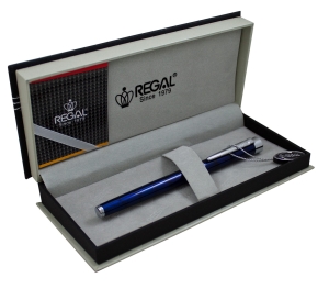 Eleganckie pióro REGAL "Katherine " w kolorze czerwonym ze srebrno - złotą stalówką (1,8 x 0,8 cm), ozdobioną grawerem z emblematem marki Regal. Pióro zapakowany w ozdobne pudełko.