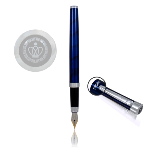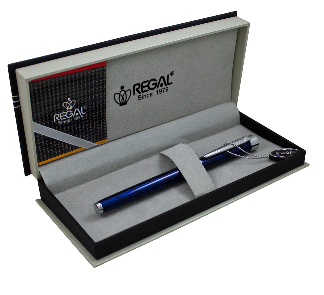 stalówką (1,8 x 0,8 cm), ozdobioną grawerem z emblematem marki Regal. Pióro