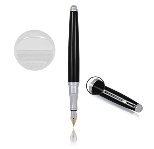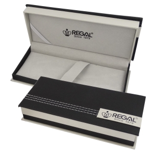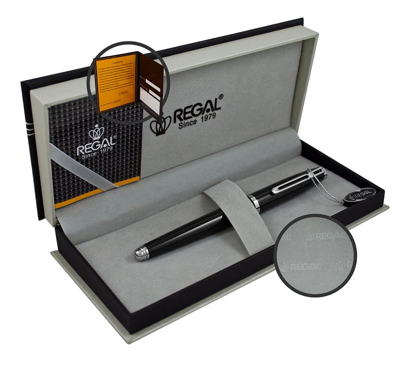 Eleganckie pióro REGAL "Buckingham" w kolorze czarno-srebrnym ze srebrno - złotą stalówką (1,8 x 0,8 cm), ozdobioną grawerem z emblematem marki Regal. Zestaw zapakowany w ozdobne pudełko.