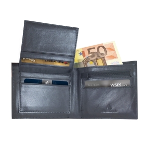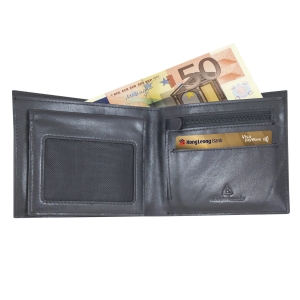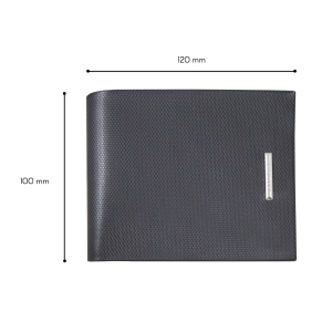 Portfel skórzany kolor grafit. Wewnątrz: 2 przegródki na banknoty, 8 kieszonek na karty płatnicze, dokumenty, drobne i foto. Wielkość po złożeniu 12 x 10 cm.