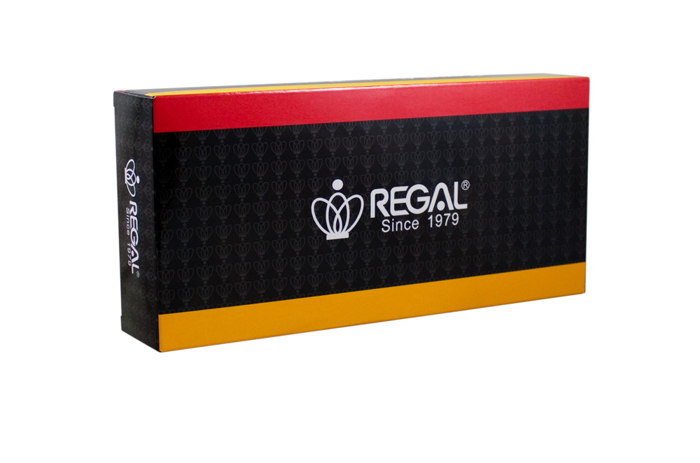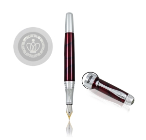 Eleganckie pióro REGAL "Andrew" ww kolorze transparentnym czerwonym i srebrnym okuciami ze złotą stalówką (1,8 x 0,8 cm), ozdobioną grawerem z emblematem marki Regal. Zestaw zapakowany w ozdobne pudełko.