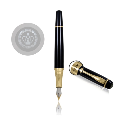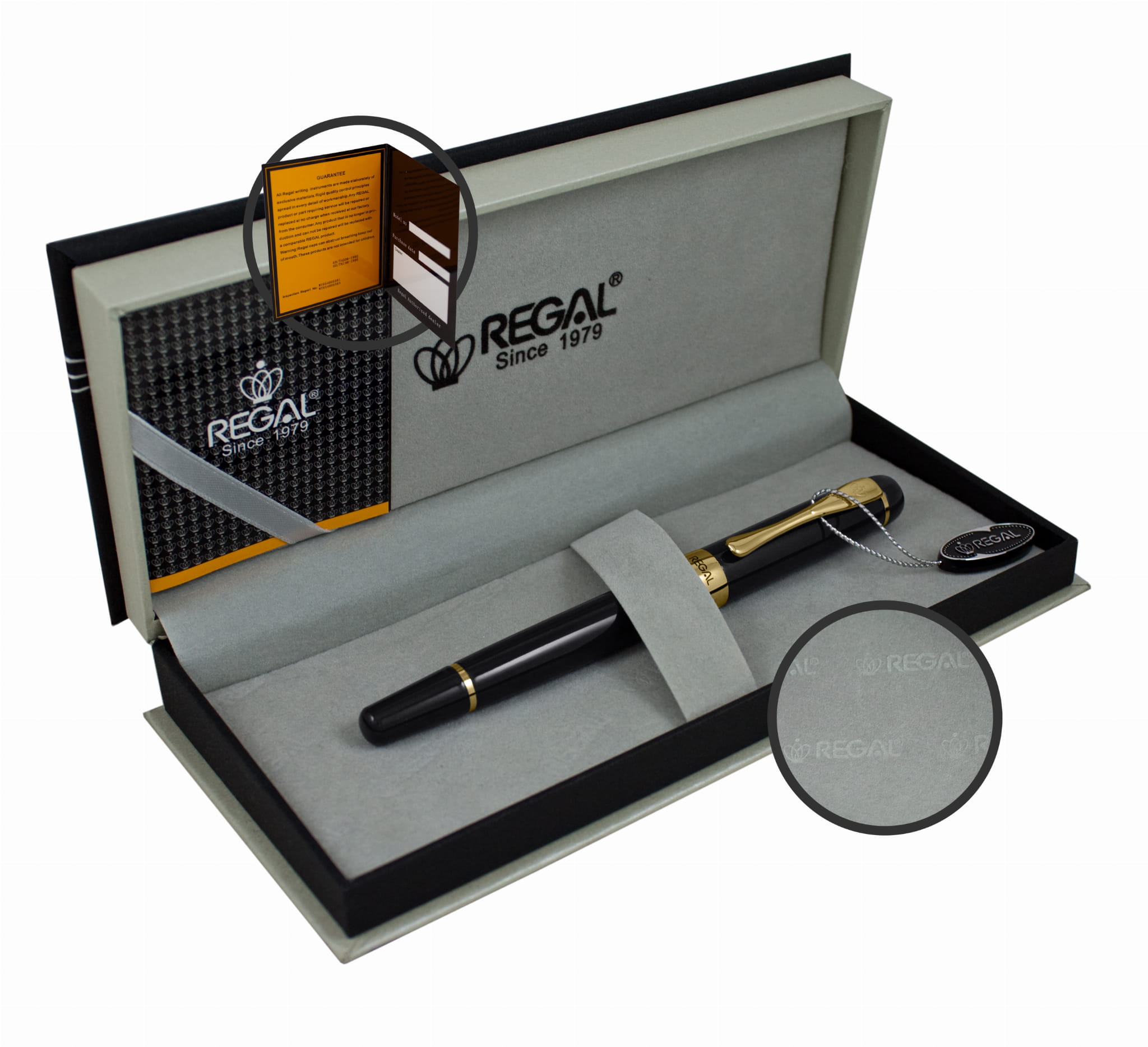 Eleganckie pióro REGAL "Andrew" w kolorze czarno-złotym ze srebrno - złotą stalówką (1,8 x 0,8 cm), ozdobioną grawerem z emblematem marki Regal. Zestaw zapakowany w ozdobne pudełko.