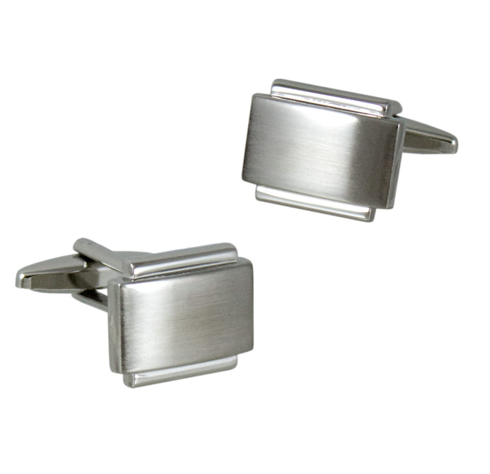 Komplet eleganckich spinek, wykonanych ze stali, w kolorze srebrnym z półmatowym wykończeniem. Spinki charakteryzują się niepowtarzalnym wzornictwem i wysoką jakością. Wielkość 1,9 x 1,5 cm