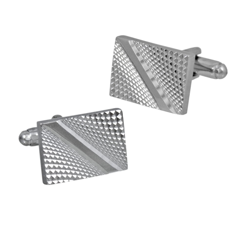 Komplet eleganckich spinek do mankietów wykonanych ze stali w kolorze srebrnym. Spinki w wykończeniu błyszczącym. Posiadają fantazyjnie narzynaną powierzchnię. Spinki charakteryzują się niepowtarzalnym wzornictwem i wysoką jakością. Wielkość 1,8 x 1,3 cm. Zapakowane w eleganckie, czarne, flokowane pudełko.