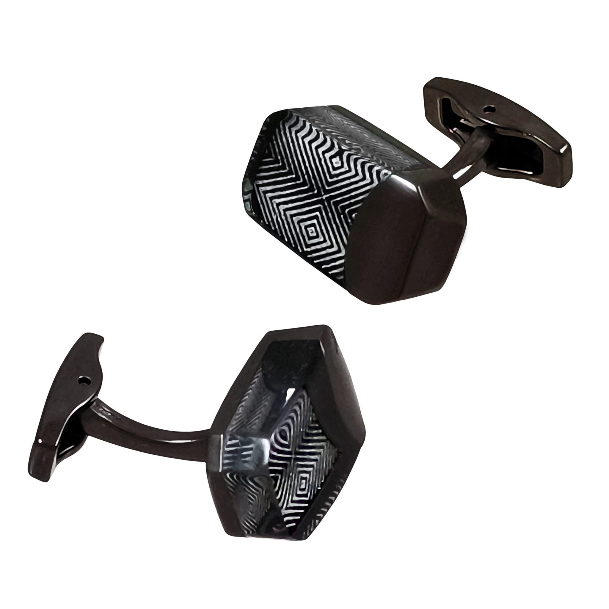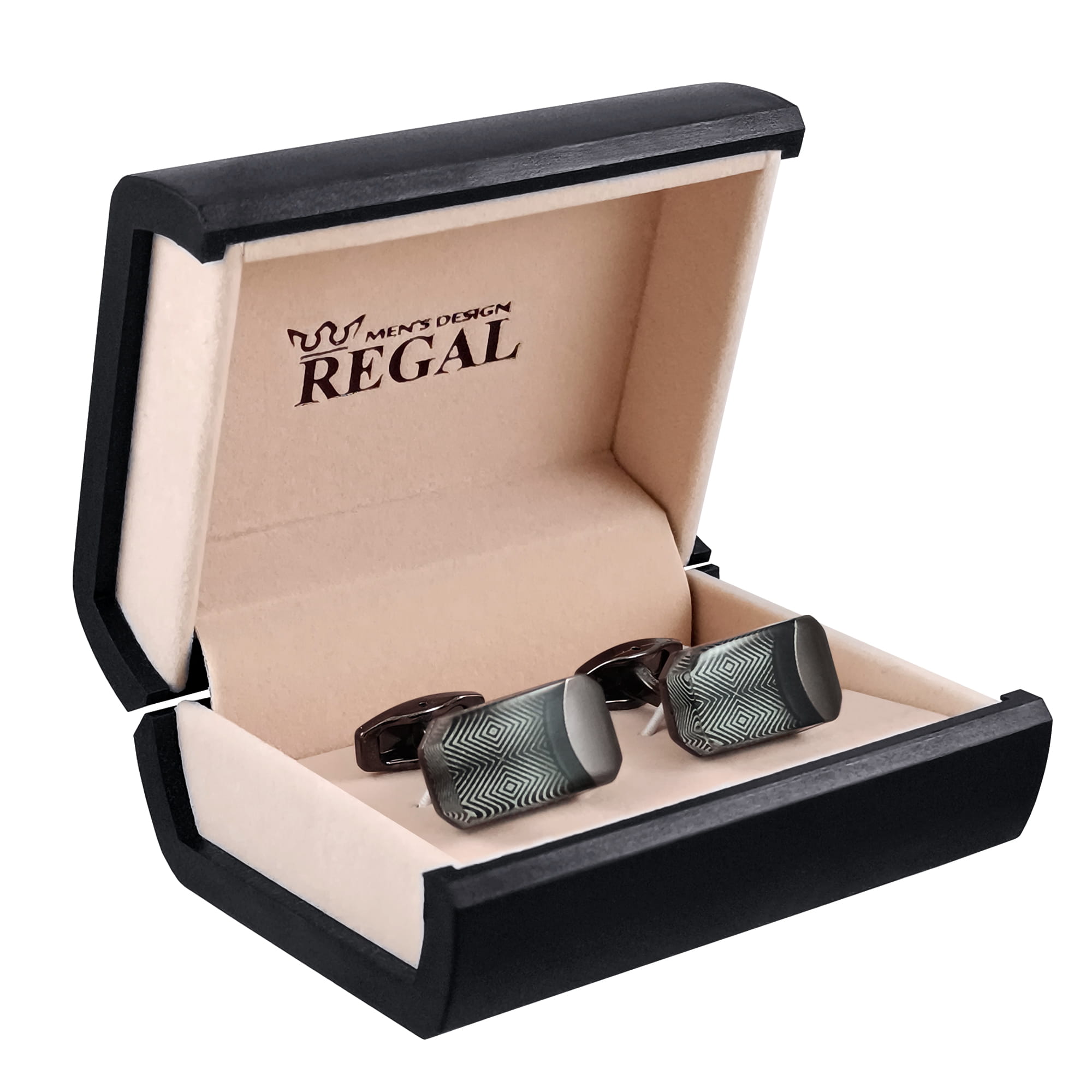 Komplet eleganckich spinek do mankietów marki "REGAL men's design" wykonanych ze stali w kolorze grafit z akrylowym zdobieniem czarno - białym. Wymiar spinek 21.5*12.5 mm. Logowane opakowanie w kolorach czarnym z flokowanym łososiowym wewnątrz pudełkiem.