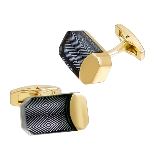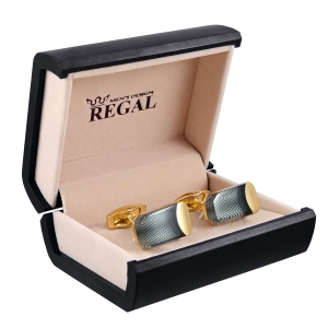 Komplet eleganckich spinek do mankietów marki "REGAL men's design" wykonanych ze stali w kolorze złotym i akrylu z czarno - białą grafiką. Wymiar spinek 21.5*12.5 mm. Logowane opakowanie w kolorach czarnym z flokowanym łososiowym wewnątrz pudełkiem.