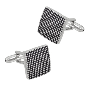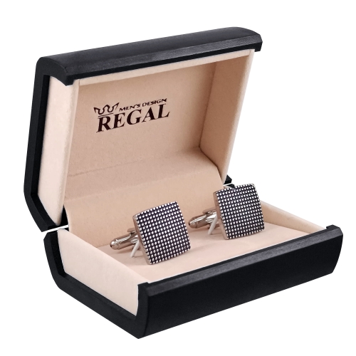 Komplet eleganckich spinek do mankietów marki "REGAL men's design" wykonanych ze stali w kolorze srebrnym z czarnym wykończeniem. Wymiar spinek 16.7*16.7 mm. Logowane opakowanie w kolorach czarnym z flokowanym łososiowym wewnątrz pudełkiem.