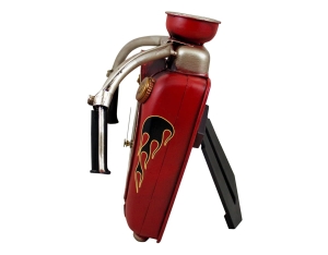 Zegar stojący z japońskim mechanizmem kwarcowym w kształcie repliki kierownicy z bakiem. Tarcza zegara czarna. Obudowa repliki wykonana z blachy stalowej pokryta farbą. Wymiary: wysokość 23 szerokość 19 głębokość 9 cm.