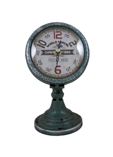 Zegar stojący z japońskim mechanizmem kwarcowym w kształcie repliki szperacza samochodowego kolor zielonkawo rdzawy z cyferblatem world travel. Obudowa repliki wykonana z blachy stalowej pokryta farbą. Wymiary: wysokość 22,3 x szerokość 12 x głębokość 12 cm.