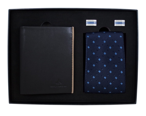 Zestaw zawierający designerski portfel wykonany ze skóry, dwie spinki do koszuli oraz krawat żakardowy. Zestaw zapakowany w eleganckie pudełko ze wstążką.